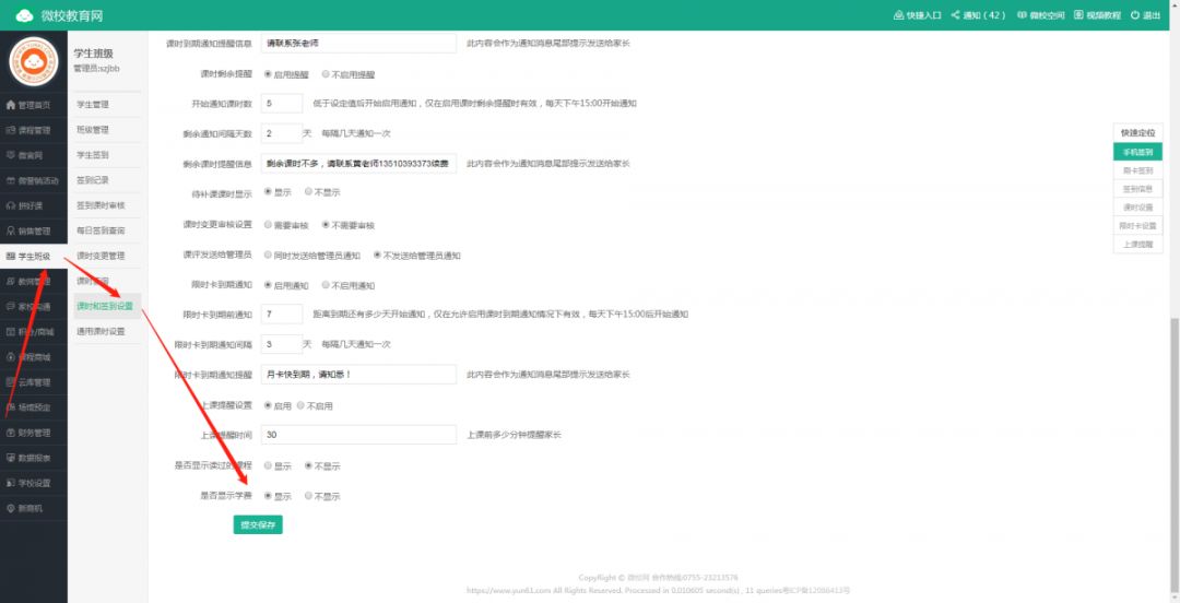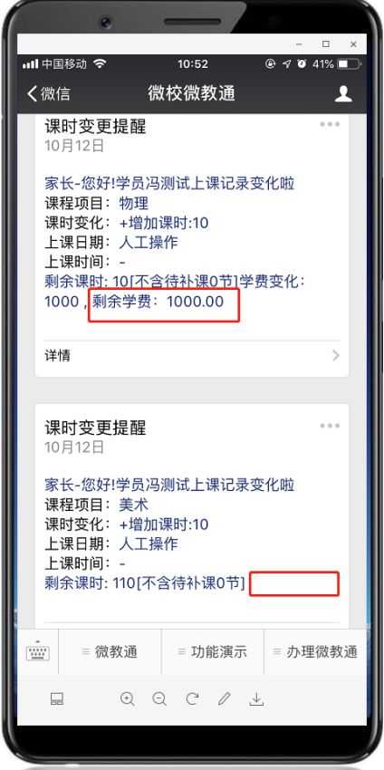添加剩余课时显示设置后台添加是否显示学费设置,默认不显示。机构可以自主设置。可以控制微信端课时变更提醒是否显示学费。