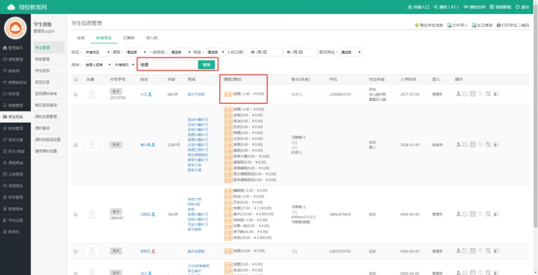 学生管理添加课程筛选条件在学生管理的筛选中添加了课程关键词的筛选,可以直接筛选对应的课程。更方便老师管理。