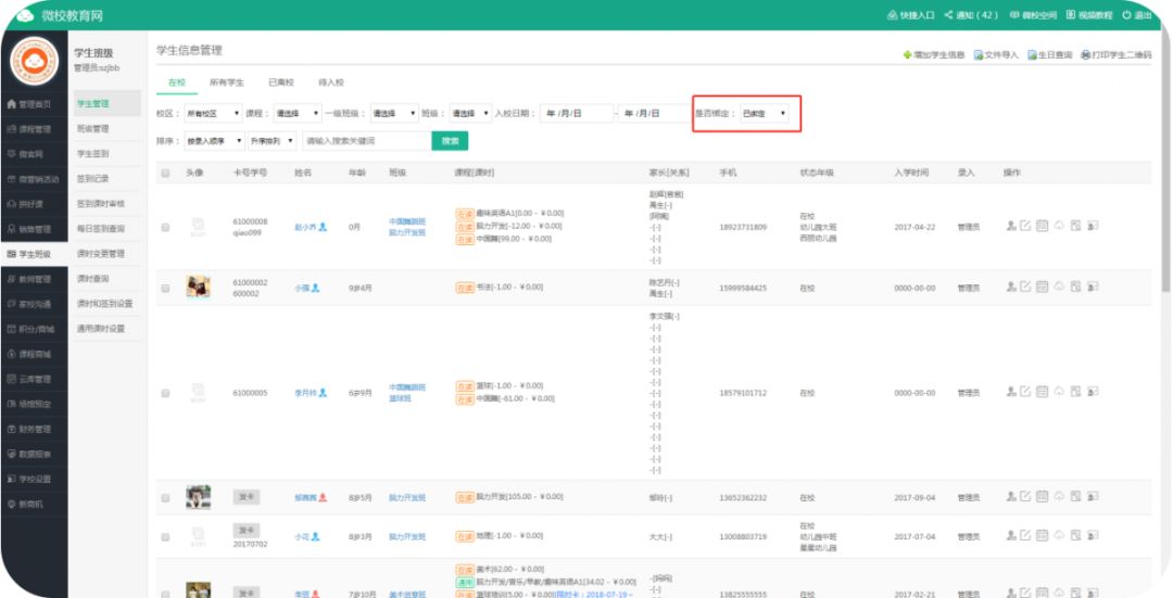 学生管理处添加筛选条件在学生管理处添加了是否绑定家长的筛选条件,可以筛选出哪些学生已绑定家长,可以让机构很清晰的了解到绑定情况。