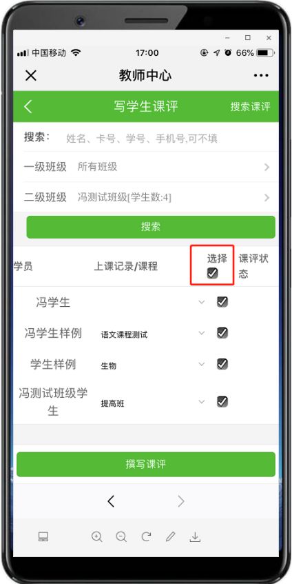 在教师中心的课评中添加了全选功能,老师可以点击全选给全部学生进行课评,方便老师教学管理。