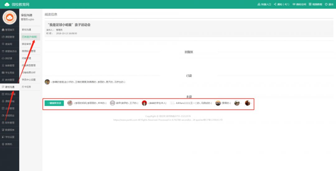 添加一键重发功能在家校沟通中,添加了未读信息的一键发送,可以将信息发送给没有阅读的家长。使沟通成本更低更便捷,再也不用担心家长漏读重要信息了。