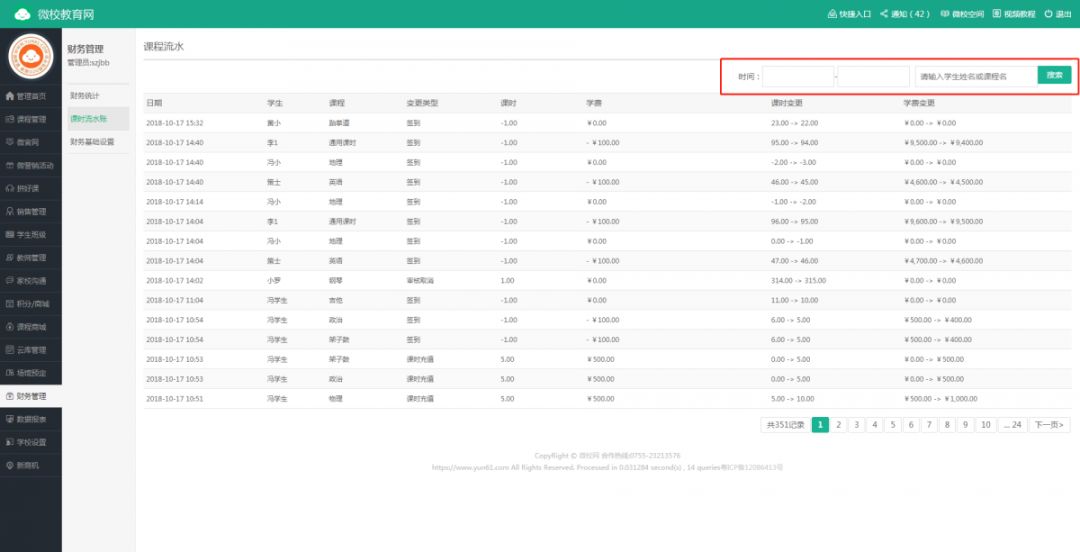 课程流水账中添加筛选功能在财务管理的课程流水账中添加了筛选功能,可以输入学生姓名或课程名进行筛选,方便查找。