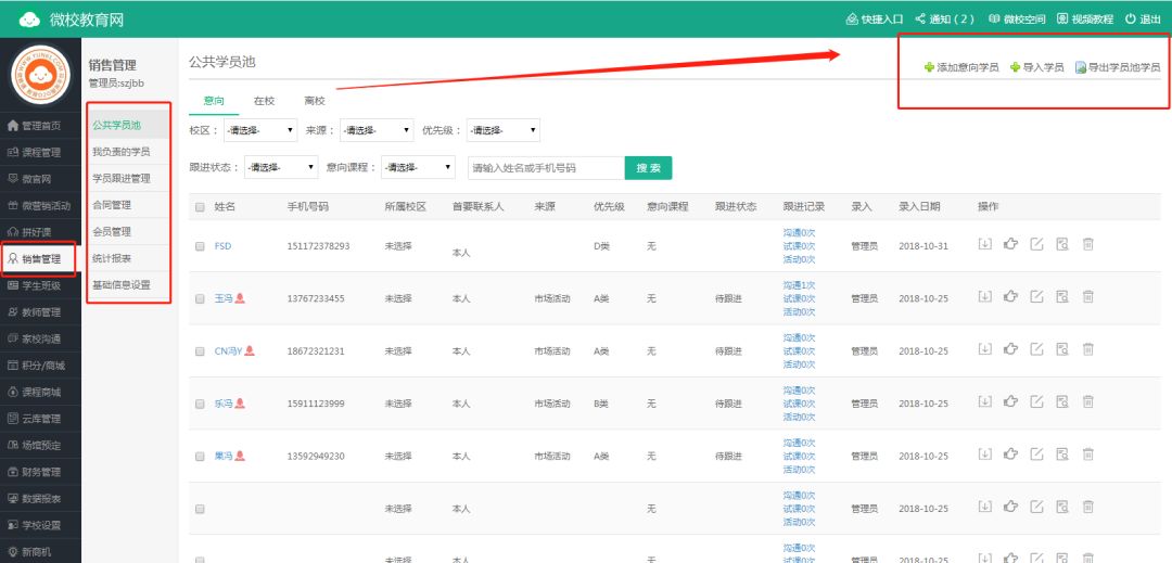 可以在公共学员池中领取学员继续跟进,也可以将我负责的学员放入公共学员池。