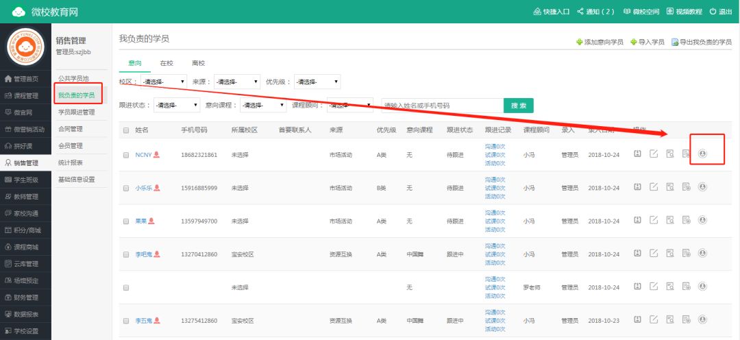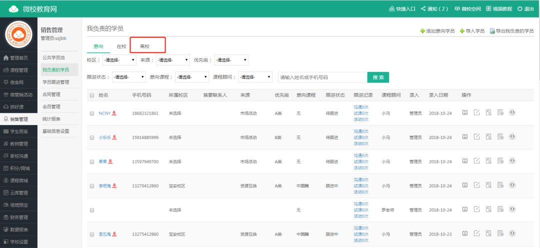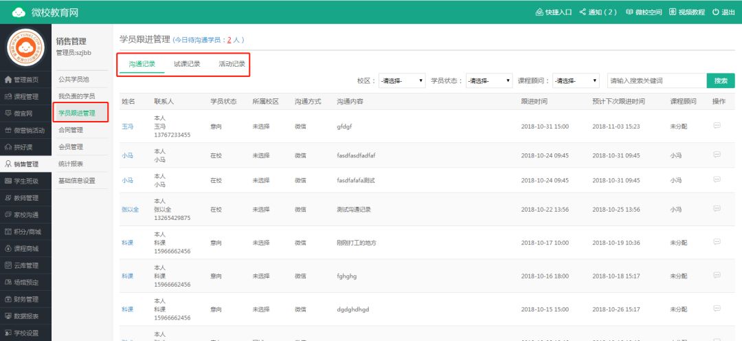 所有的跟进信息会在学员跟进管理处显示,可以很直观的知道对该学员的跟进情况。