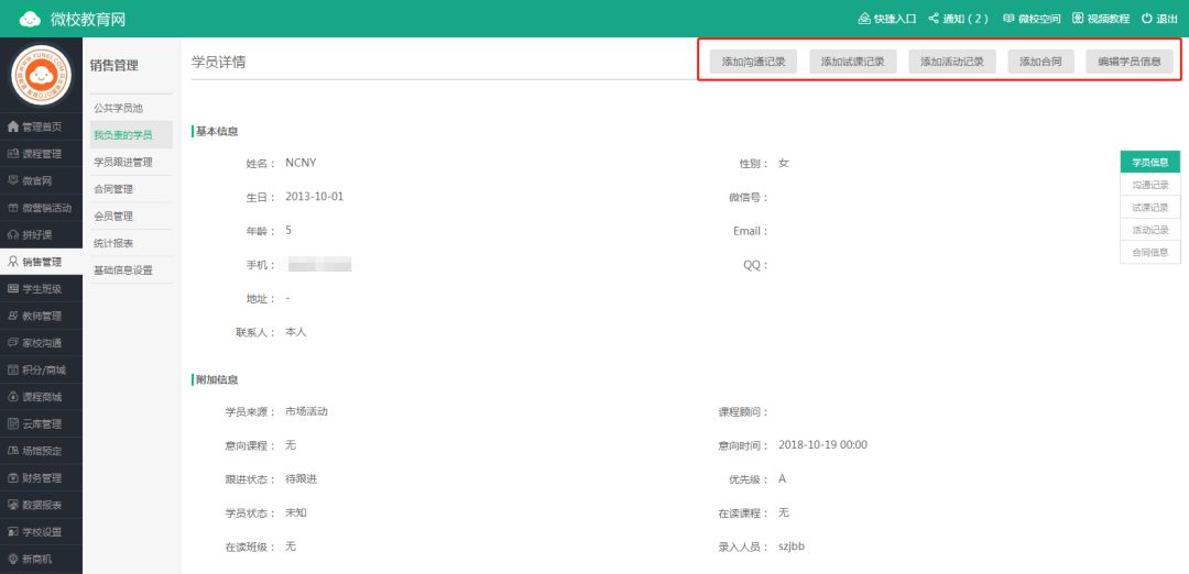 在学员详情里可以点击相应的按键进行编辑相应的跟进信息。