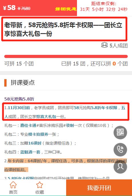 示例一:让已报名家长学员参与拼课做团长,拼课课时可以加入他们总课时,设置老学员福利鼓励他们进行转发